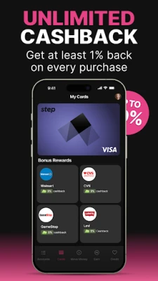 Unlimited cashback and 4% on savings requires Step Black enrollment, either through qualifying direct deposit or paid monthly membership.