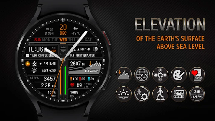 Information watch face showing the elevation of the earth's surface above sea level according to your GPS coordinates.